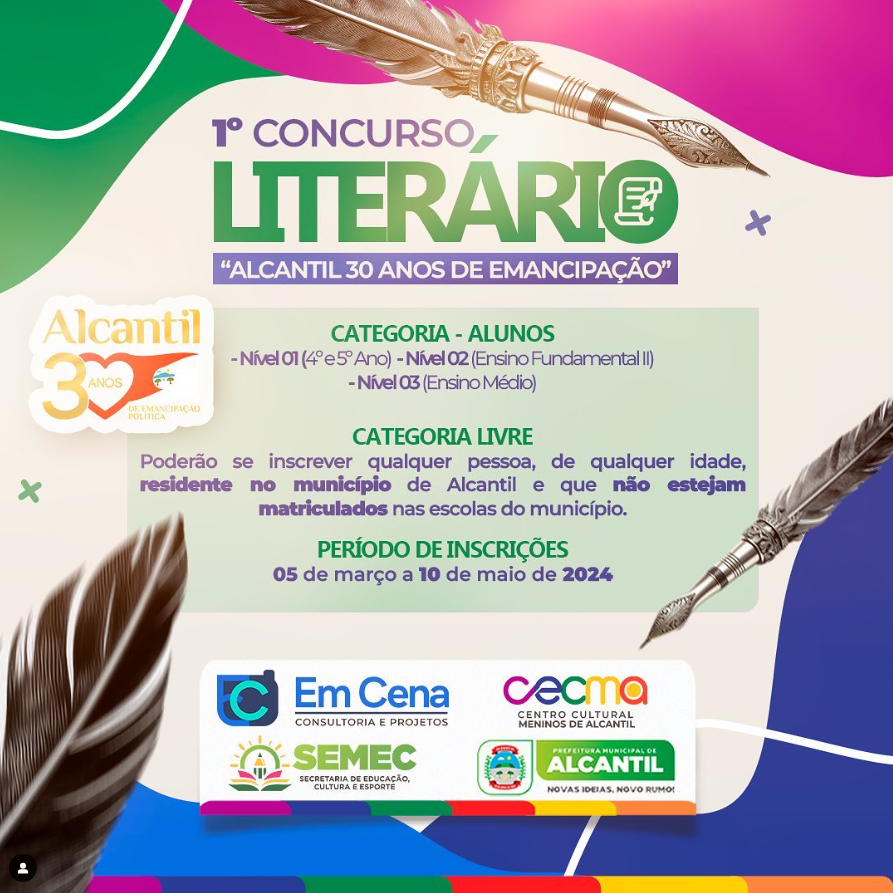 Casa da Cultura e CECMA Avenida São José, 2695, AlcantilI CONCURSO LITERÁRIO “ALCANTIL 30 ANOS DE EMANCIPAÇÃO” O Centro Cultural Meninos de Alcantil - CECMA, torna público o EDITAL Nº 002/2024 do 1º CONCURSO LITERÁRIO, “ALCANTIL 30 ANOS DE EMANCIPAÇÃO”. Em parceria com a Prefeitura Municipal de Alcantil através da Secretaria de Educação, Cultura e Esportes, da Escola Estadual - ECIT Professora Maria Cecilia […]